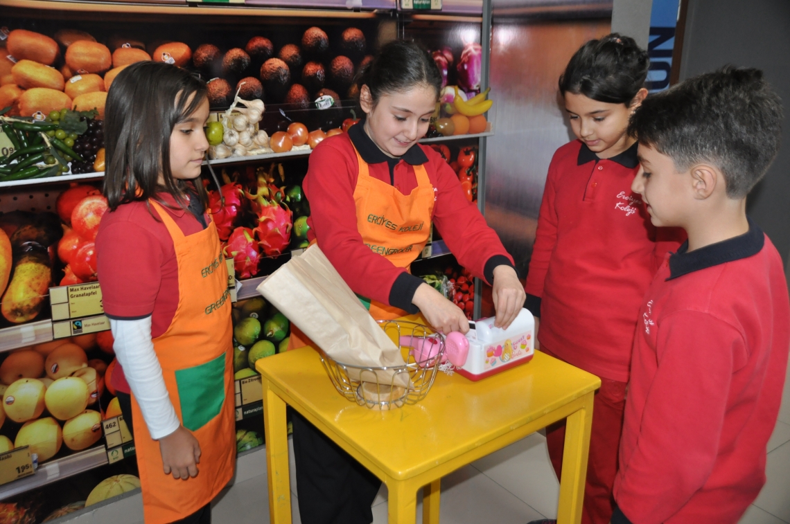 Öğrencilerimiz, temel ihtiyaçlarını gidermek için market ortamında karşılaşabilecekleri günlük diyalogları burada uygularlar.